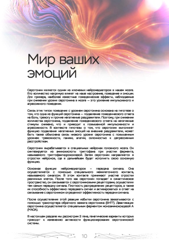 Этот ДНК анализ показывает влияние наиболее важных 10 генов на психическое и эмоциональное состояние. Именно они регулируют выработку гормонов, работу нейромедиаторов. Используйте знания о природных свойствах своего организма для борьбы со стрессом, повышения работоспособности и общего тонуса. Каждый человек индивидуален, поэтому мы рекомендуем пройти наш генетический нейро тест в Елизово.