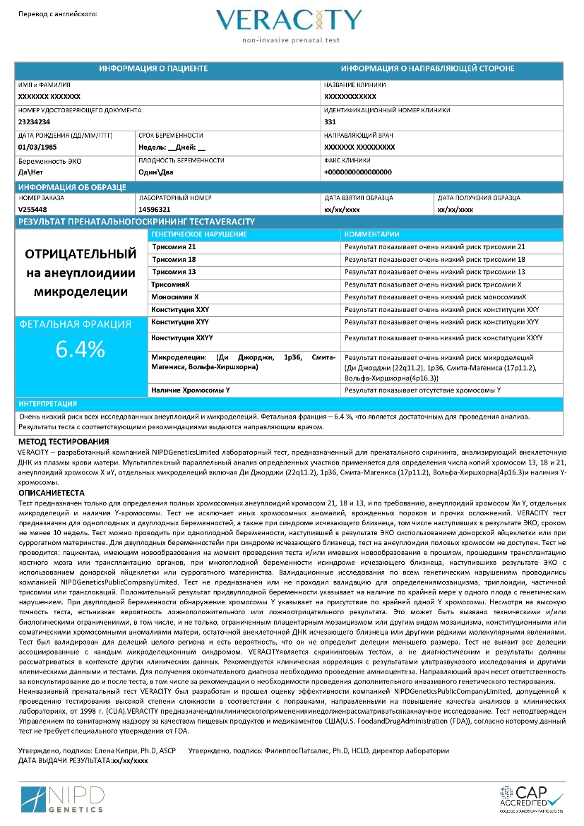 Отчет содержит четкий, легко интерпретируемый результат о наличии высокого или низкого риска хромосомной аномалии.